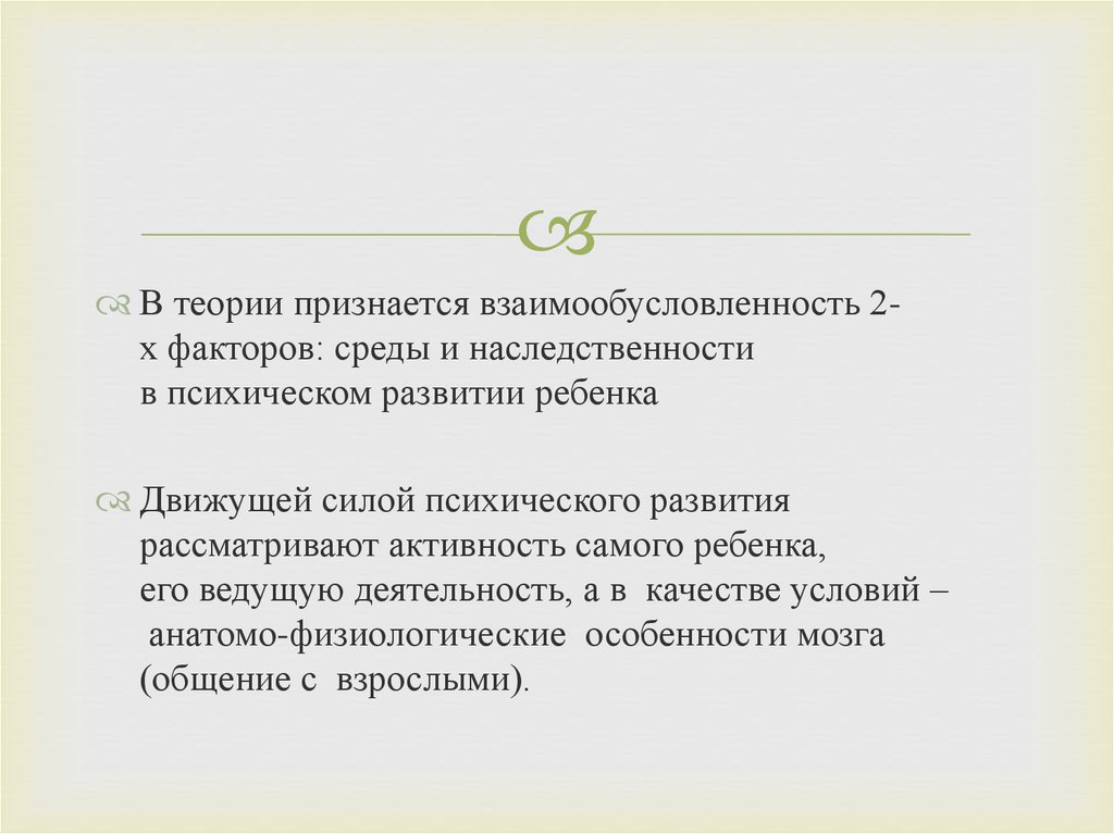В теории признается взаимообусловленность 2х факторов: среды и наследственностив психическом развитии ребенка