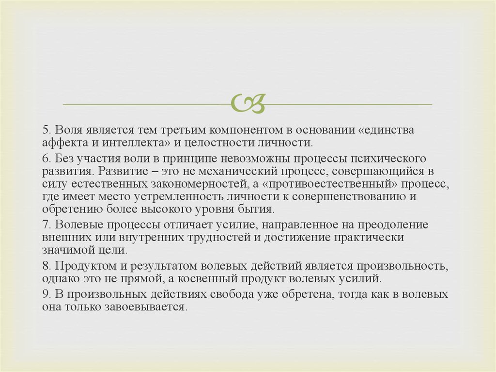 9. В произвольных действиях свобода уже обретена, тогда как в волевых