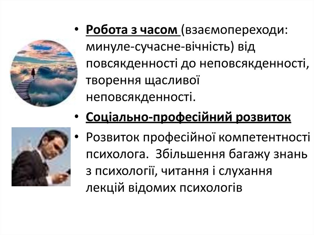 • Робота з часом (взаємопереходи:минуле-сучасне-вічність) від
