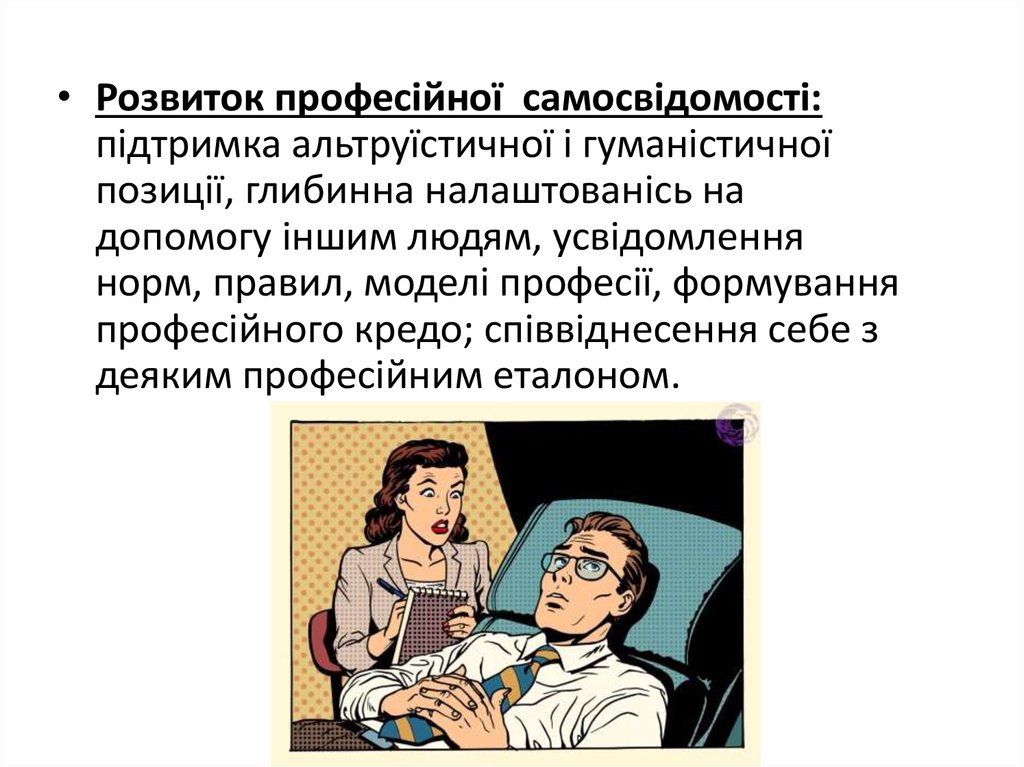 • Розвиток професійної самосвідомості:підтримка альтруїстичної і гуманістичної