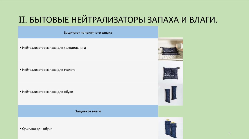 I . Влагопоглотители и нейтрализаторы запаха для автомобилей.II. Бытовые нейтрализаторы запаха и сушилки для обуви.