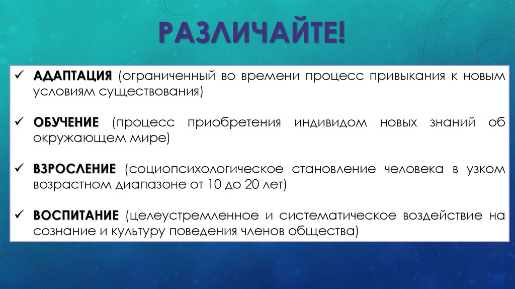 РАЗЛИЧАЙТЕ!АДАПТАЦИЯ (ограниченный во времени процесс привыкания к новым