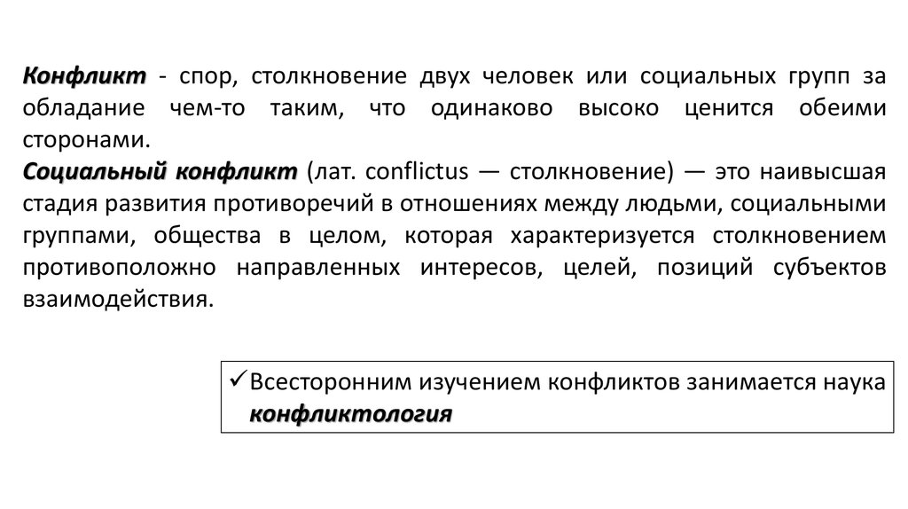 Конфликт - спор, столкновение двух человек или социальных групп зaобладание чем-то таким, что одинаково высоко ценится обеими