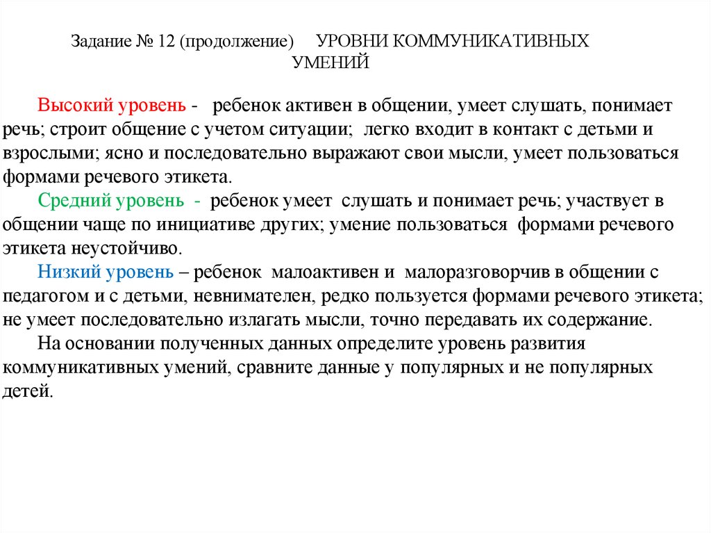 Задание № 12 (продолжение) УРОВНИ КОММУНИКАТИВНЫХУМЕНИЙ