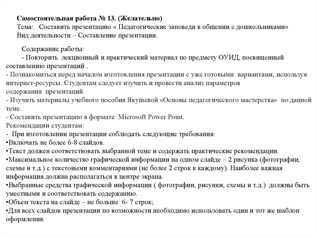 Самостоятельная работа № 13. (Желательно)Тема: Составить презентацию « Педагогические заповеди в общении с дошкольниками»