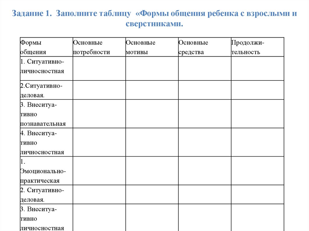 Задание 1. Заполните таблицу «Формы общения ребенка с взрослыми исверстниками.