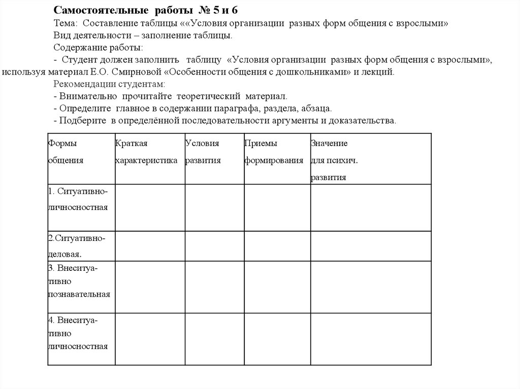 Самостоятельные работы № 5 и 6Тема: Составление таблицы ««Условия организации разных форм общения с взрослыми»
