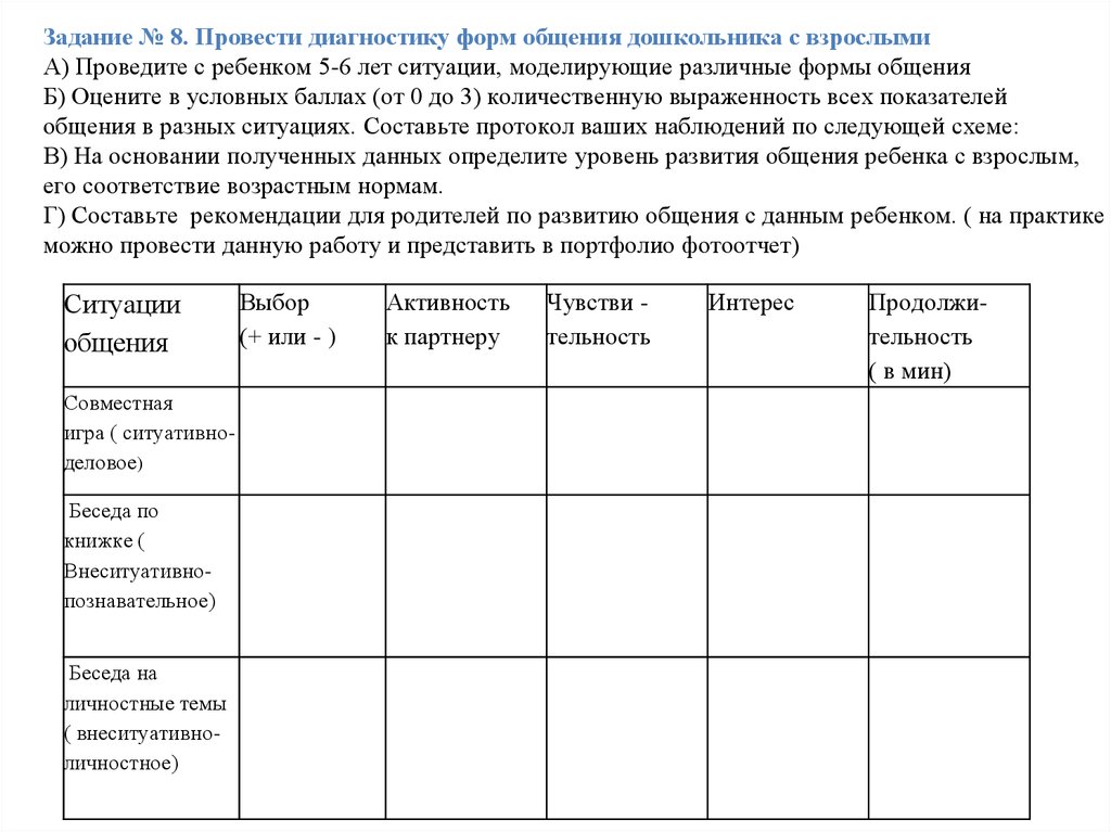 Задание № 8. Провести диагностику форм общения дошкольника с взрослымиА) Проведите с ребенком 5-6 лет ситуации, моделирующие различные формы общения