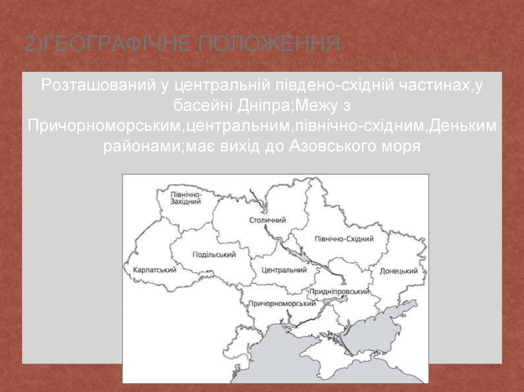 2)ГЕОГРАФІЧНЕ ПОЛОЖЕННЯРозташований у центральній південо-східній частинах,у