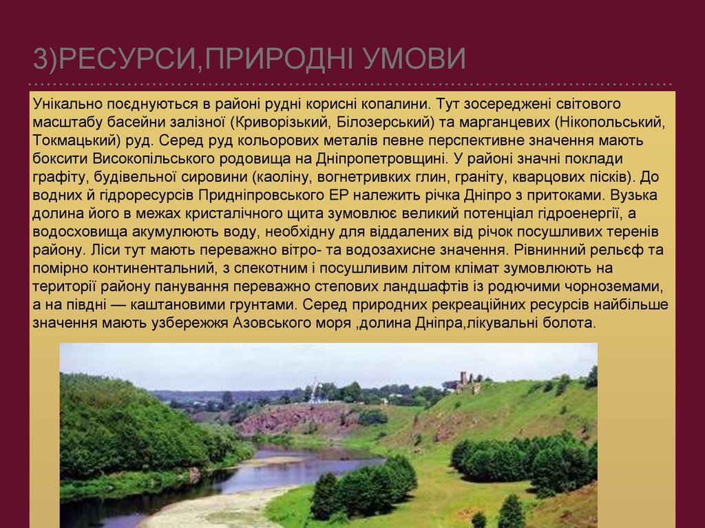 3)РЕСУРСИ,ПРИРОДНІ УМОВИУнікально поєднуються в районі рудні корисні копалини. Тут зосереджені світового