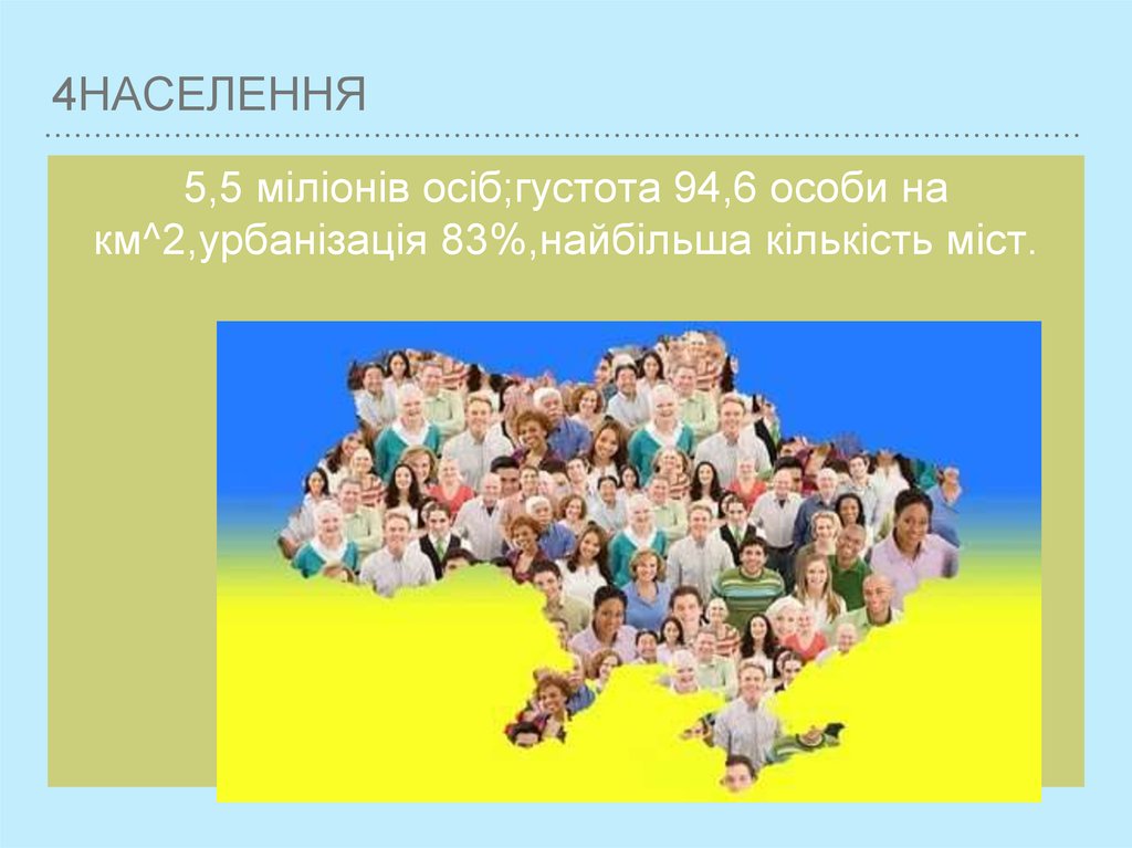 4НАСЕЛЕННЯ5,5 міліонів осіб;густота 94,6 особи на