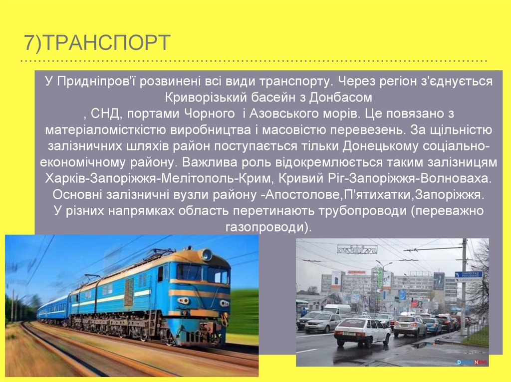 7)ТРАНСПОРТУ Придніпров'ї розвинені всі види транспорту. Через регіон з'єднується