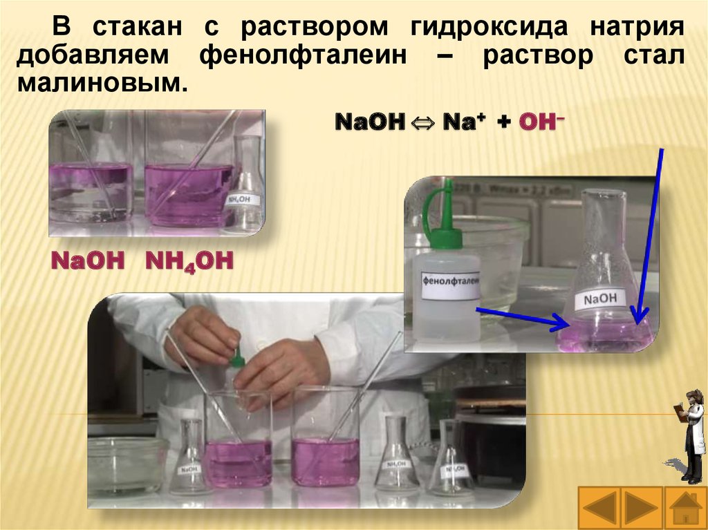 В стакан с раствором гидроксида натриядобавляем фенолфталеин – раствор стал