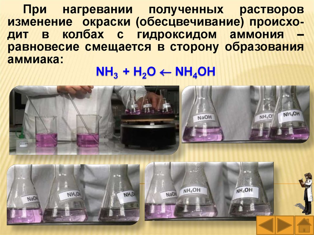 При нагревании полученных растворовизменение окраски (обесцвечивание) происходит в колбах с гидроксидом аммония –