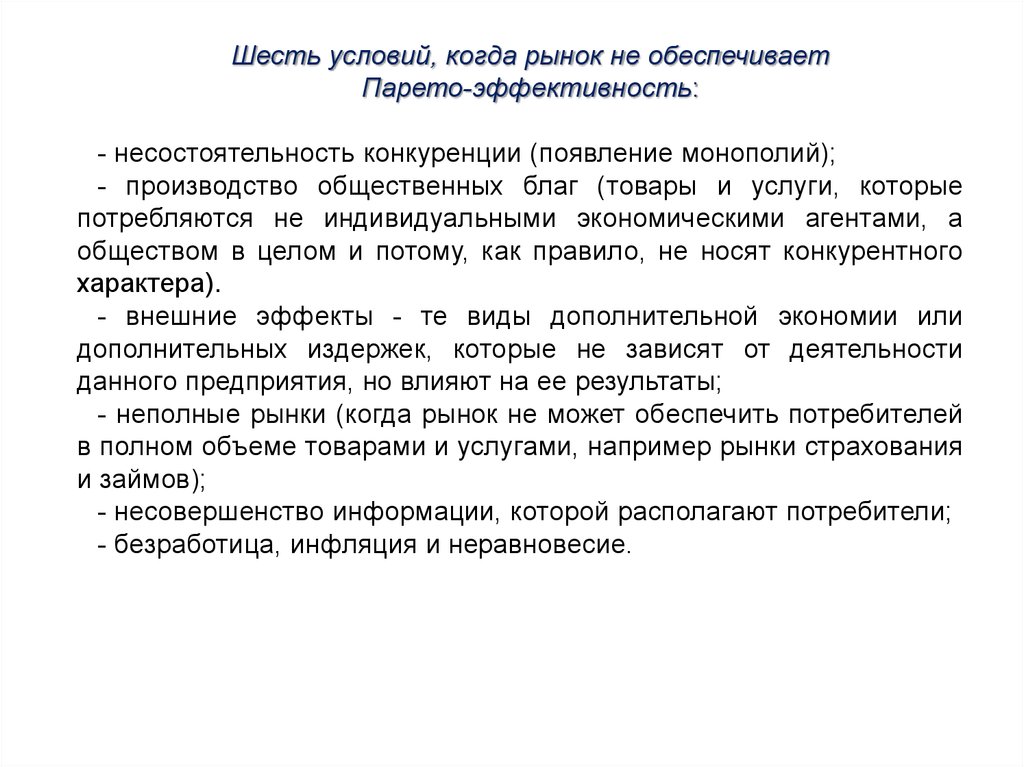 Шесть условий, когда рынок не обеспечиваетПарето-эффективность: