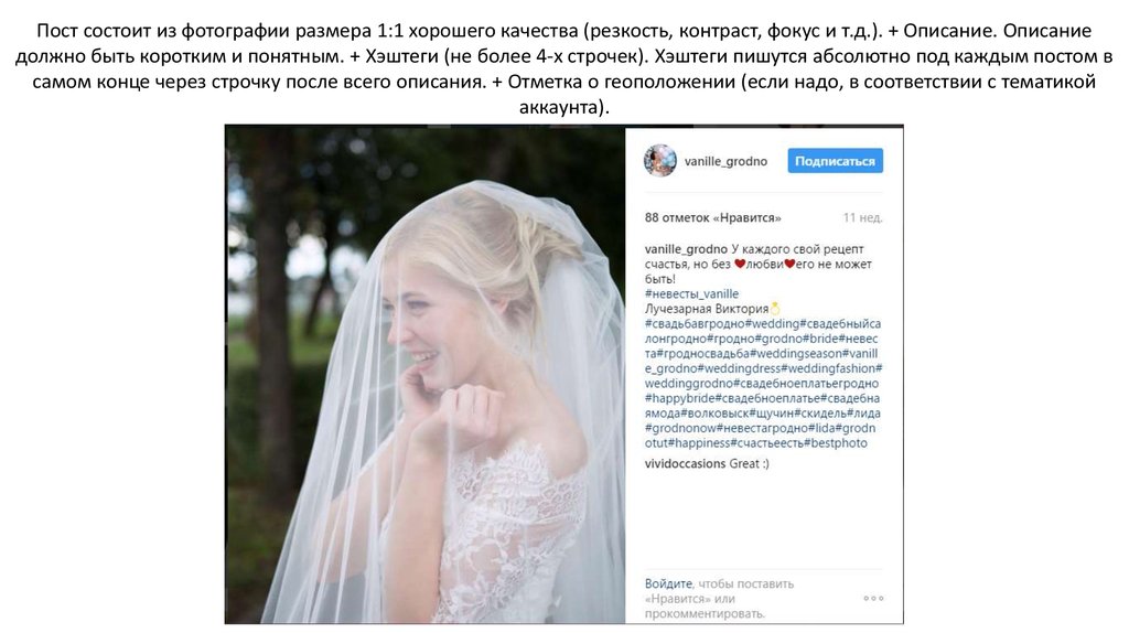 Пост состоит из фотографии размера 1:1 хорошего качества (резкость, контраст, фокус и т.д.). + Описание. Описаниедолжно быть коротким и понятным. + Хэштеги (не более 4-х строчек). Хэштеги пишутся абсолютно под каждым постом в