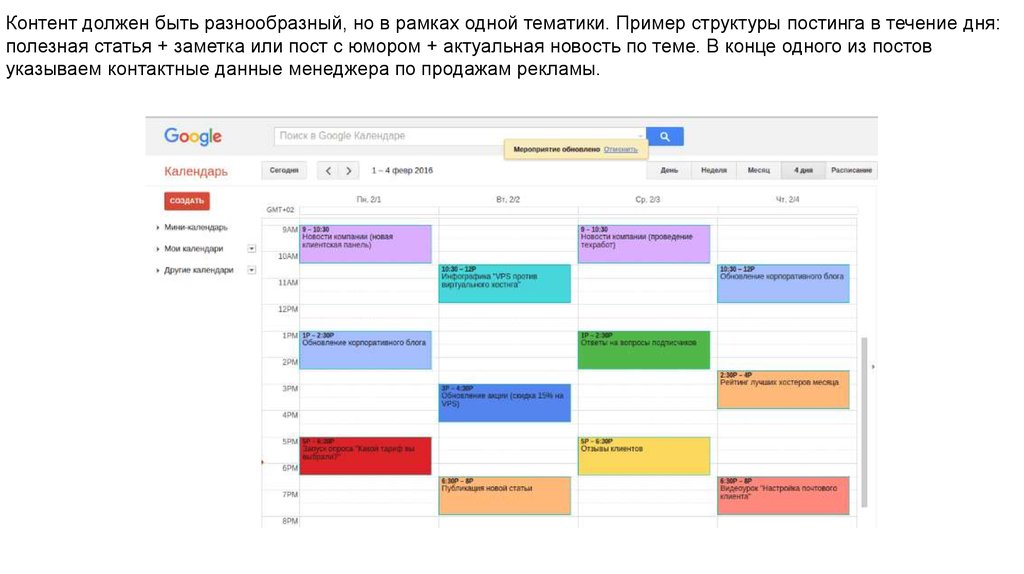 Контент должен быть разнообразный, но в рамках одной тематики. Пример структуры постинга в течение дня:полезная статья + заметка или пост с юмором + актуальная новость по теме. В конце одного из постов