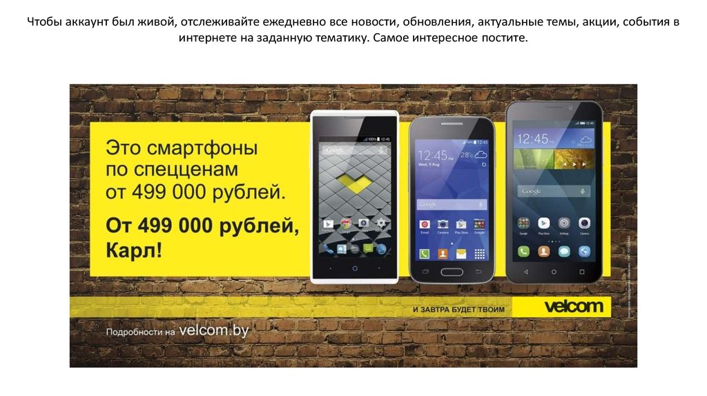 Чтобы аккаунт был живой, отслеживайте ежедневно все новости, обновления, актуальные темы, акции, события винтернете на заданную тематику. Самое интересное постите.