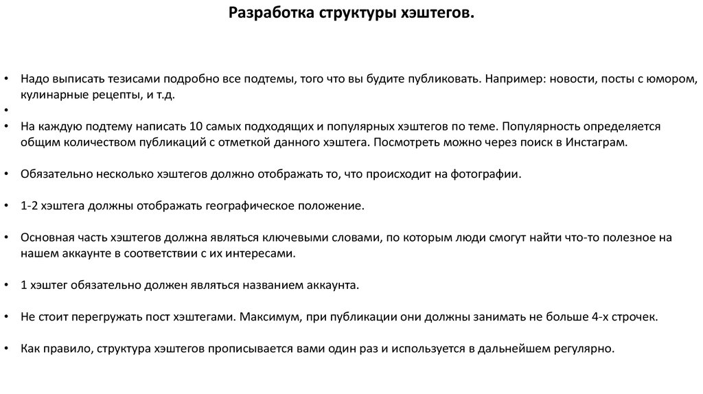 Разработка структуры хэштегов.• Надо выписать тезисами подробно все подтемы, того что вы будите публиковать. Например: новости, посты с юмором,
