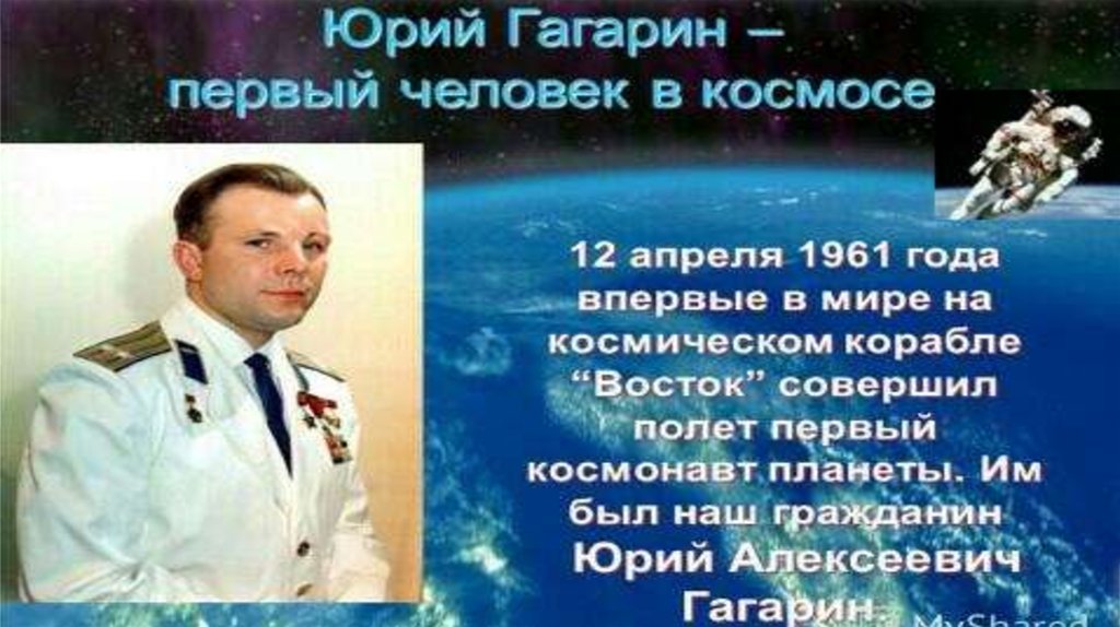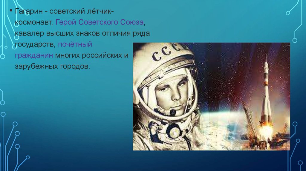 • Гагарин - советский лётчиккосмонавт, Герой Советского Союза,кавалер высших знаков отличия ряда