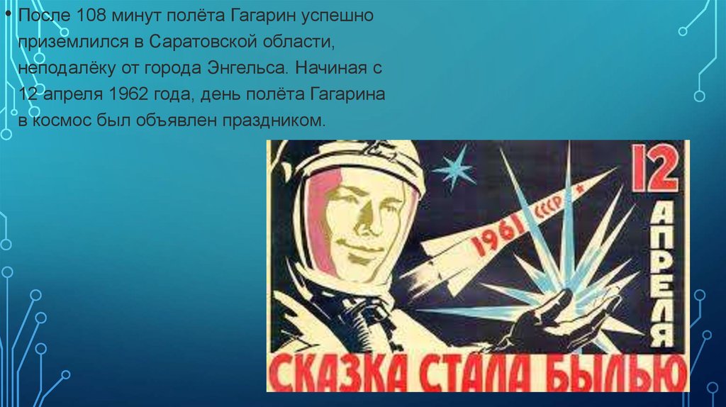 • После 108 минут полёта Гагарин успешноприземлился в Саратовской области,