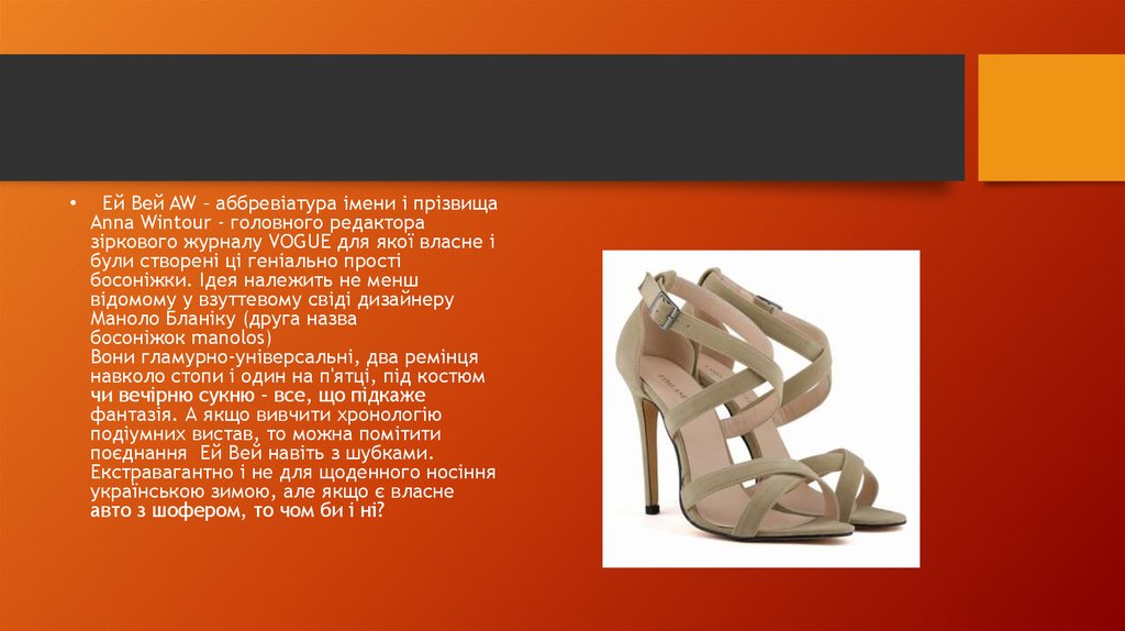 • Вдягаючи туфлі чи босоніжки чи замислюєтеся ви, що вони зовсім нетуфлі, а наприклад ті-страпи? І зовсім це не босоніжки, а ейвеї або