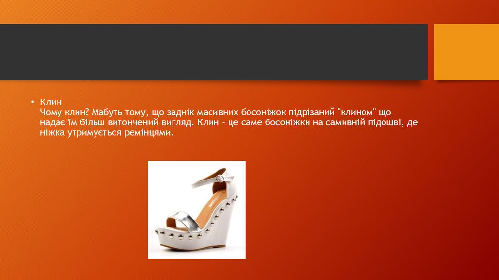 • КлинЧому клин? Мабуть тому, що заднік масивних босоніжок підрізаний "клином" що