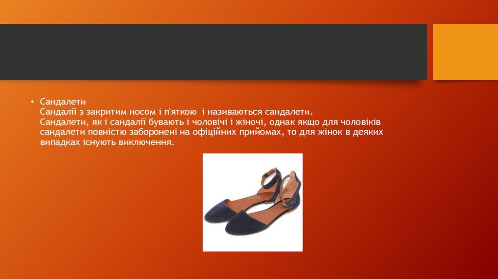 • СандалетиСандалії з закритим носом і п'яткою і називаються сандалети.