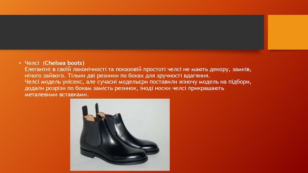 • Челсі (Chelsea boots)Елегантні в своїй лаконічності та показовій простоті челсі не мають декору, замків,