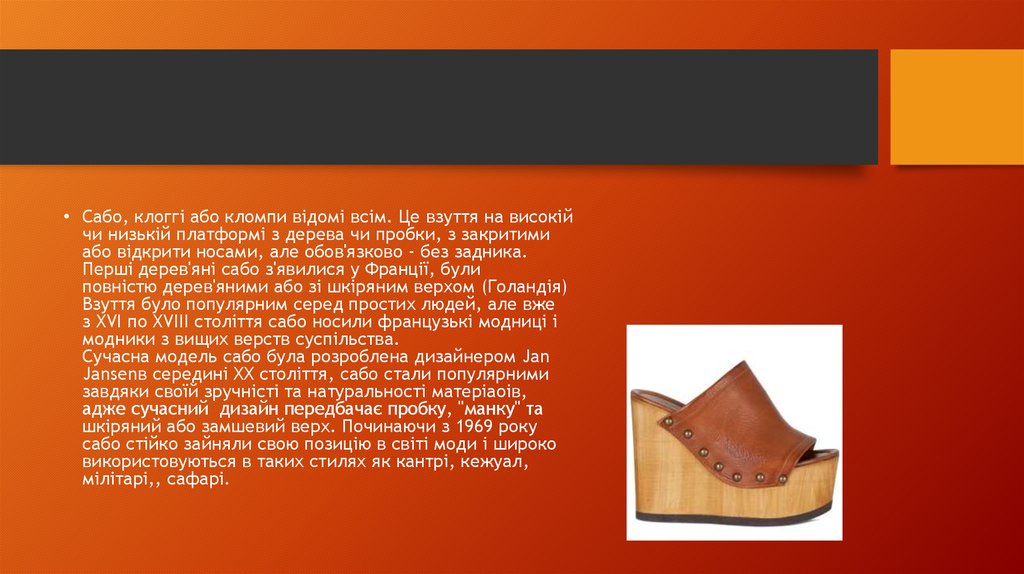 • Сабо, клоггі або кломпи відомі всім. Це взуття на високійчи низькій платформі з дерева чи пробки, з закритими