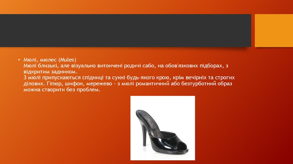 • Мюлі, мюлес (Mules)Мюлі близькі, але візуально витончені родичі сабо, на обов'язкових підборах, з