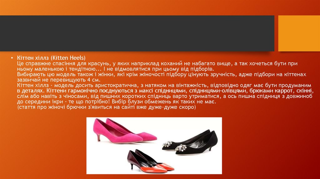 • Кіттен хіллз (Kitten Heels)Це справжне спасіння для красунь, у яких наприклад коханий не набагато вище, а так хочеться бути при