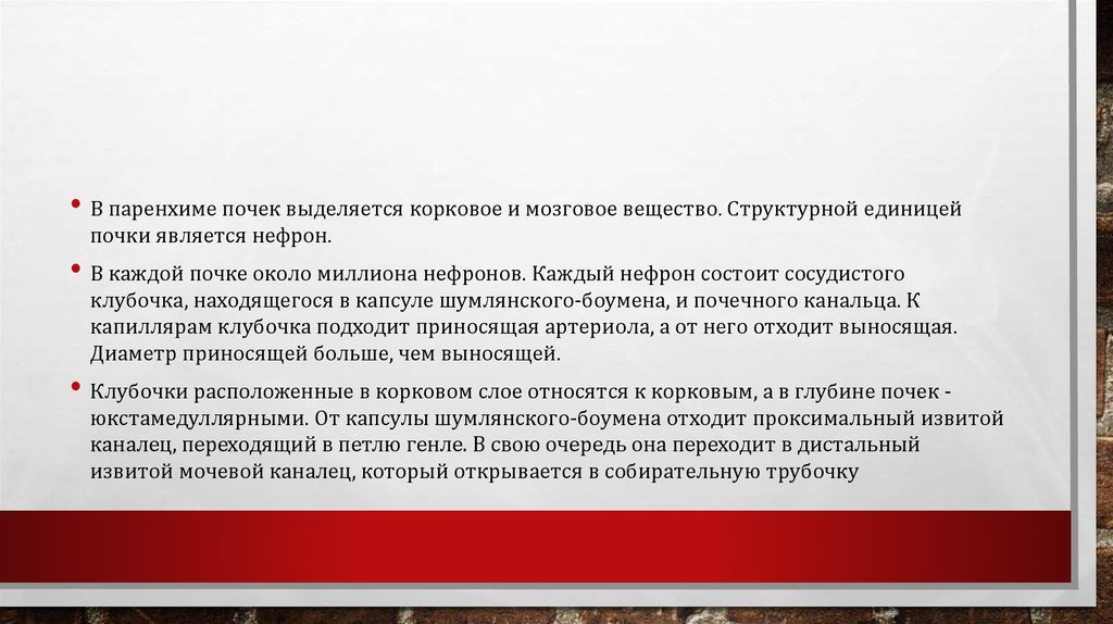 • В паренхиме почек выделяется корковое и мозговое вещество. Структурной единицейпочки является нефрон.