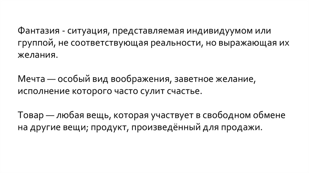 Фантазия - ситуация, представляемая индивидуумом илигруппой, не соответствующая реальности, но выражающая их