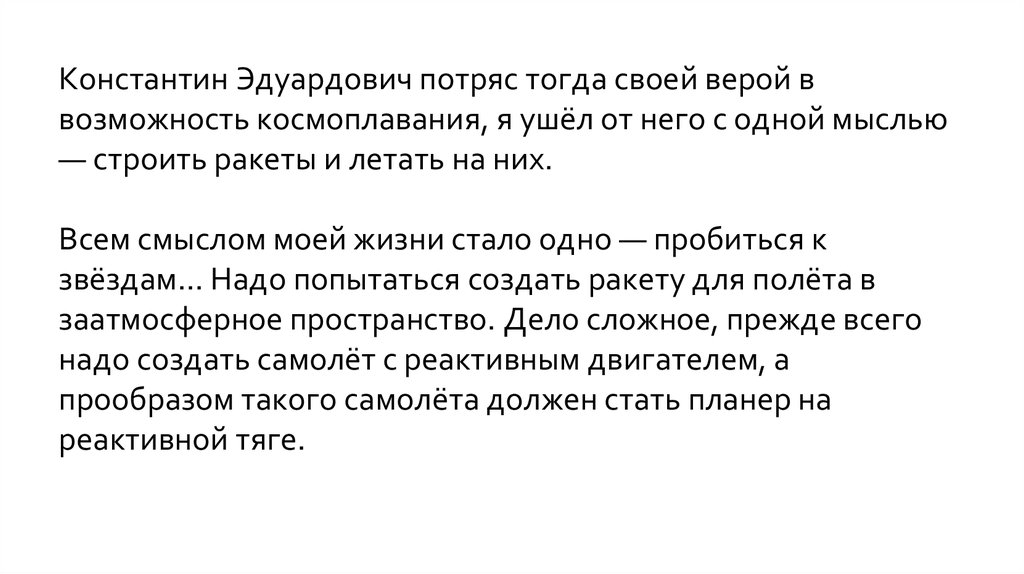 Константин Эдуардович потряс тогда своей верой ввозможность космоплавания, я ушёл от него с одной мыслью