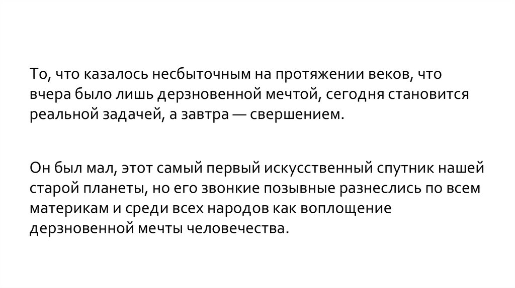 То, что казалось несбыточным на протяжении веков, чтовчера было лишь дерзновенной мечтой, сегодня становится