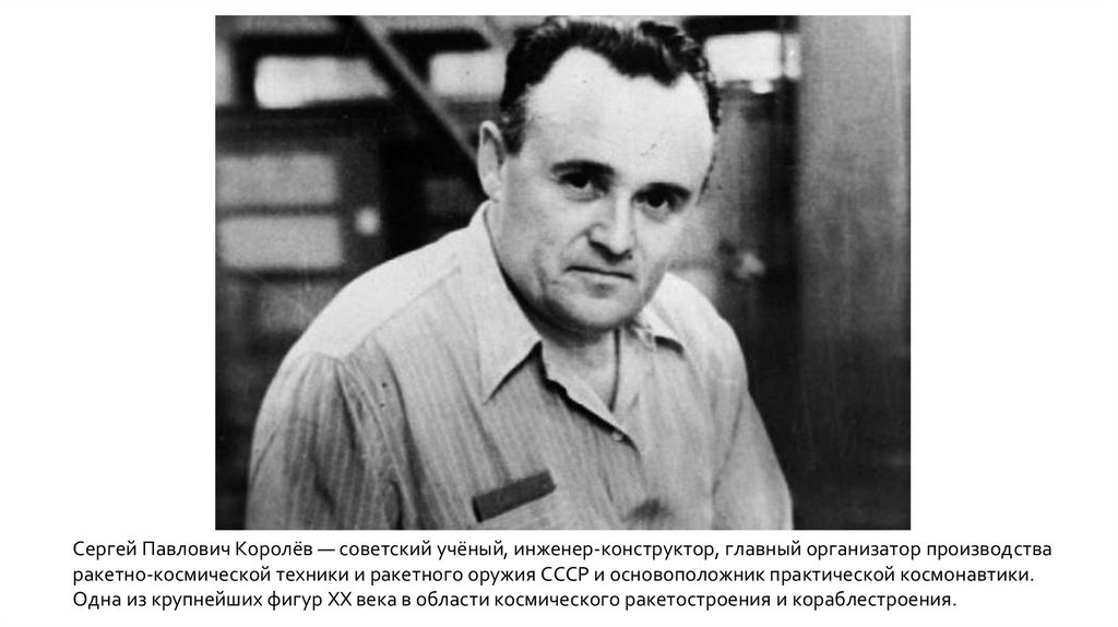 Сергей Павлович Королёв — советский учёный, инженер-конструктор, главный организатор производстваракетно-космической техники и ракетного оружия СССР и основоположник практической космонавтики.