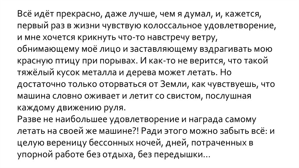 Всё идёт прекрасно, даже лучше, чем я думал, и, кажется,первый раз в жизни чувствую колоссальное удовлетворение,
