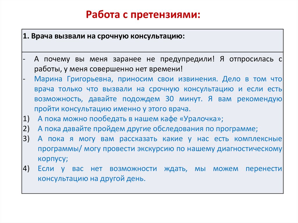 Работа с претензиями:1. Врача вызвали на срочную консультацию: