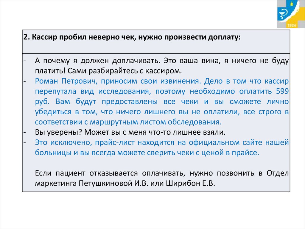 Если пациент отказывается оплачивать, нужно позвонить в Отдел