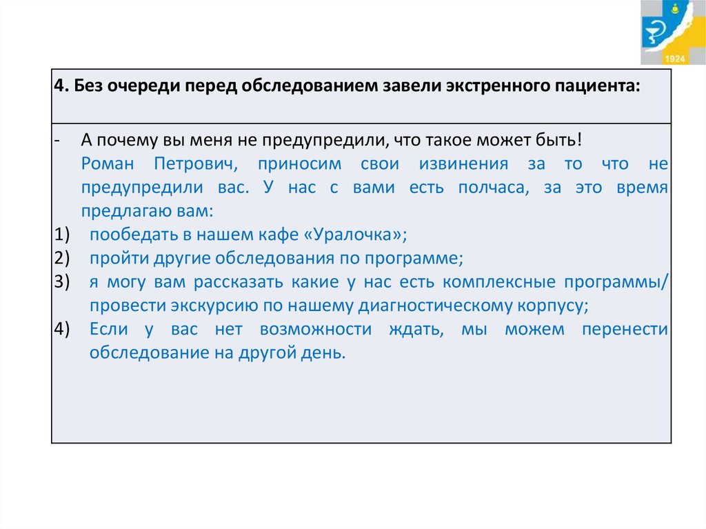 4. Без очереди перед обследованием завели экстренного пациента:-
