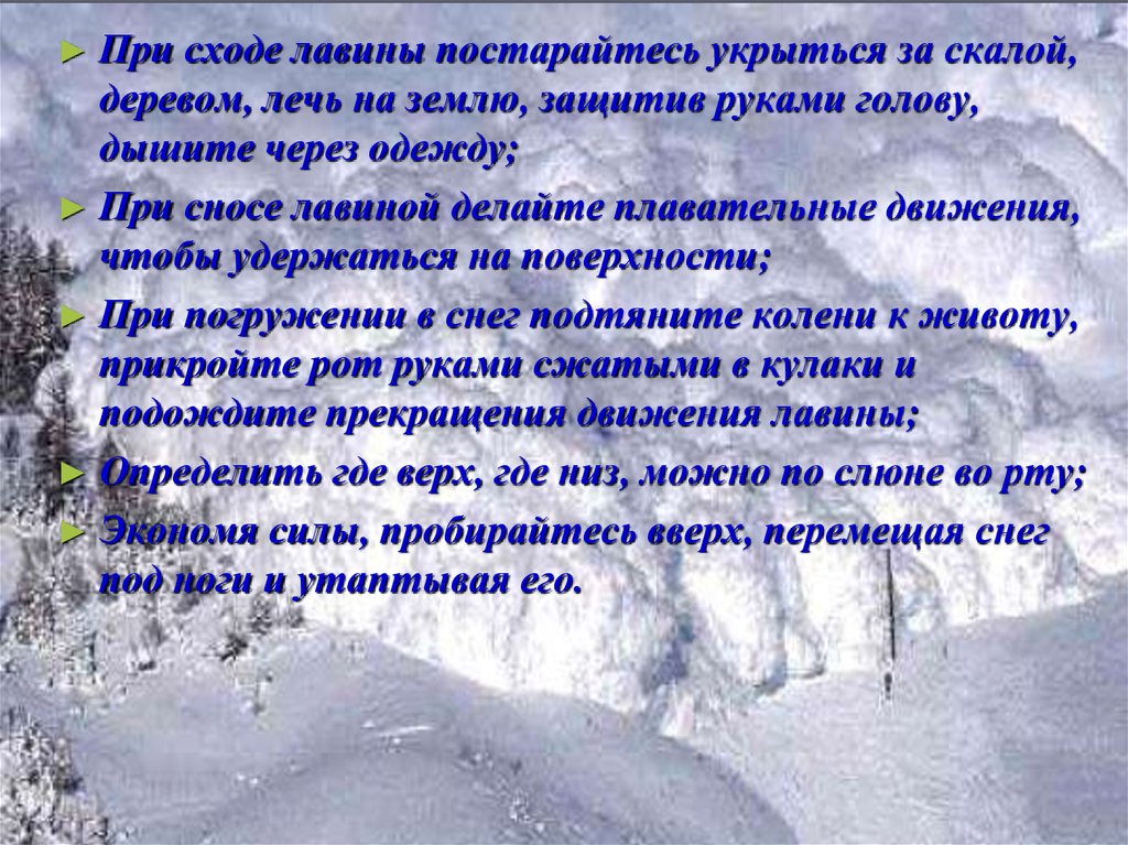При сходе лавины постарайтесь укрыться за скалой,деревом, лечь на землю, защитив руками голову,