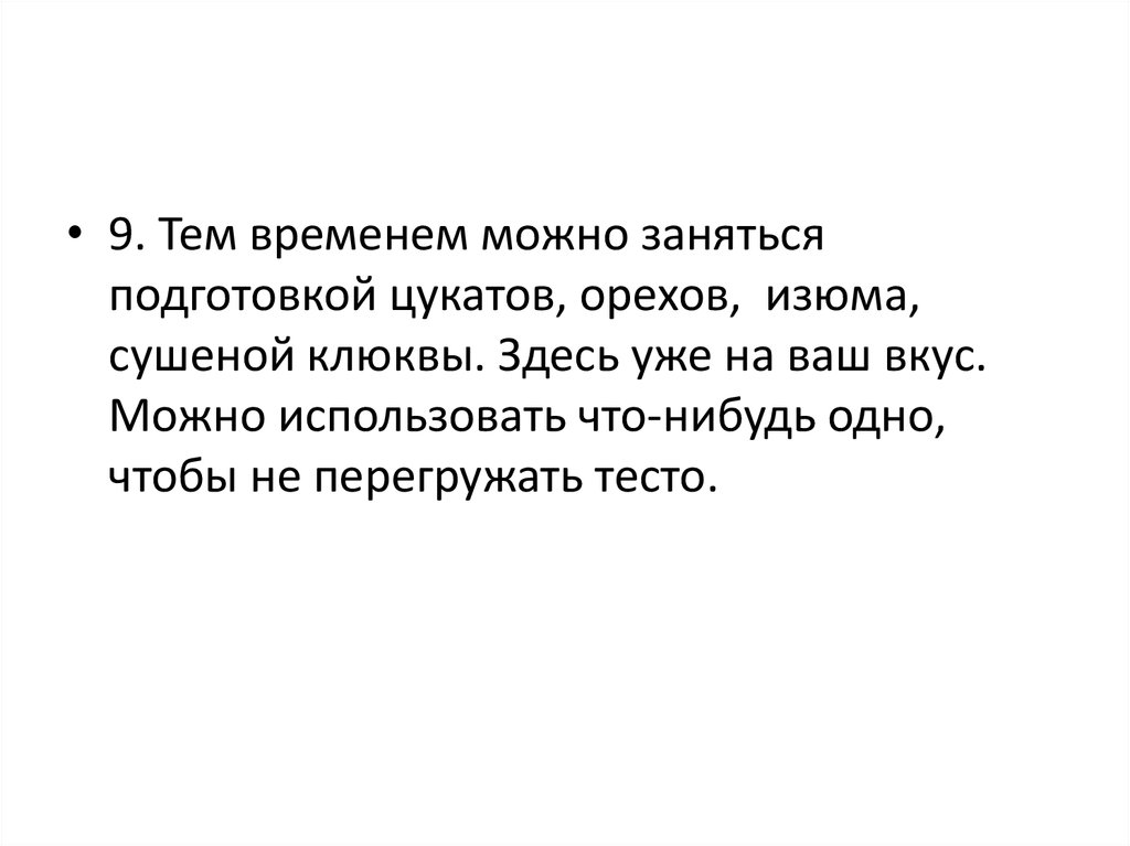 • 9. Тем временем можно занятьсяподготовкой цукатов, орехов, изюма,