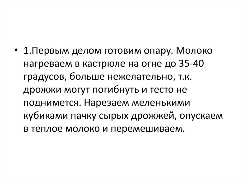 • 1.Первым делом готовим опару. Молоконагреваем в кастрюле на огне до 35-40