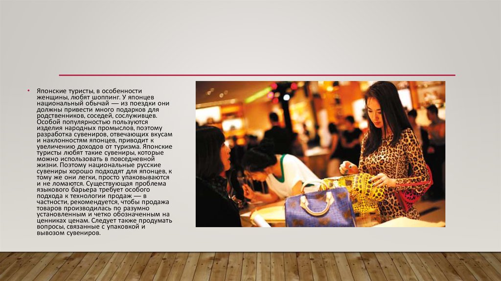 • Японские туристы, в особенностиженщины, любят шоппинг. У японцев