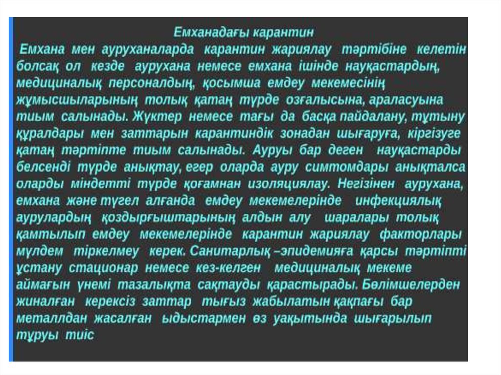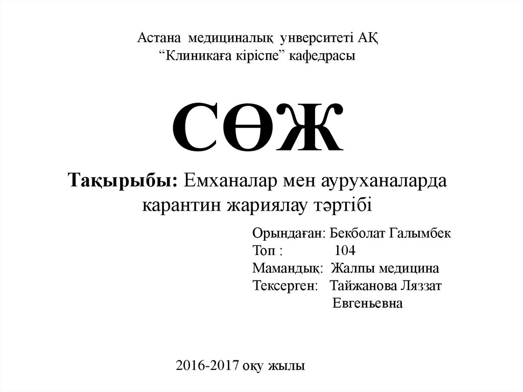 1. Астана медициналық унверситеті АҚ “Клиникаға кіріспе” кафедрасы СӨЖ Тақырыбы: Емханалар мен ауруханаларда карантин жариялау тәртібі