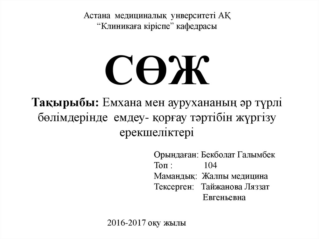 1. Астана медициналық унверситеті АҚ “Клиникаға кіріспе” кафедрасы СӨЖ Тақырыбы: Емхана мен аурухананың әр түрлі бөлімдерінде емдеу- қорға