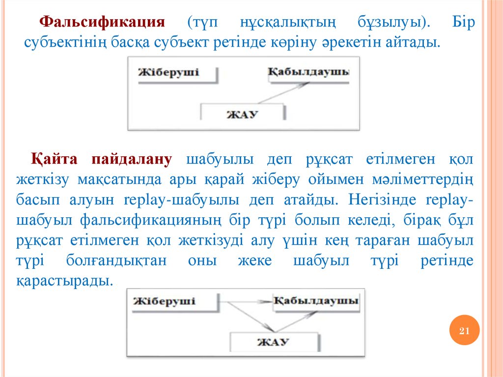 басып алуын replay-шабуылы деп атайды. Негізінде replayшабуыл фальсификацияның бір түрі болып келеді, бірақ бұл