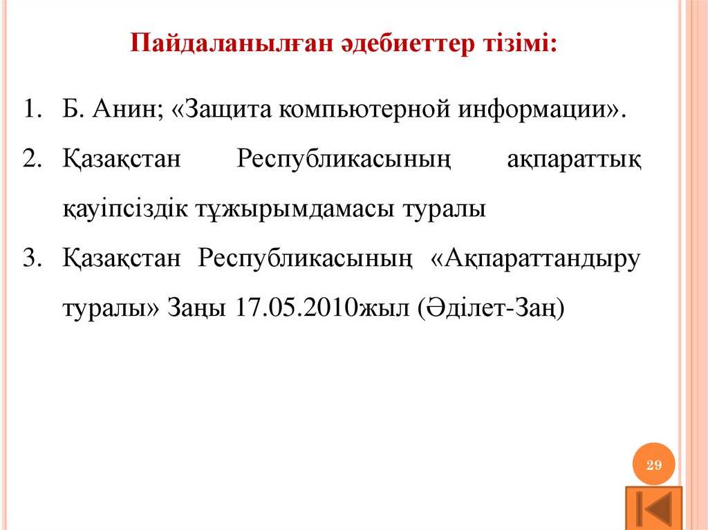 Пайдаланылған әдебиеттер тізімі:1. Б. Анин; «Защита компьютерной информации».