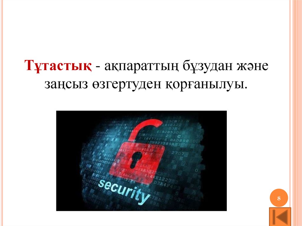 Тұтастық - ақпараттың бұзудан жәнезаңсыз өзгертуден қорғанылуы.